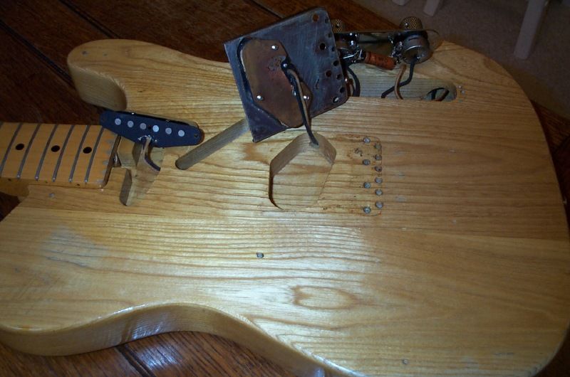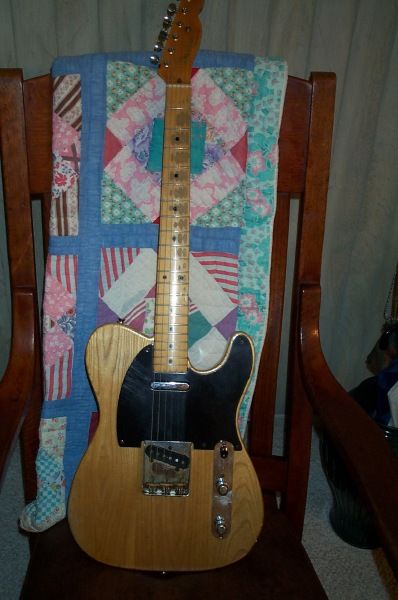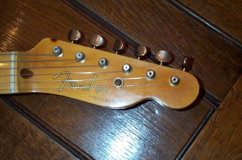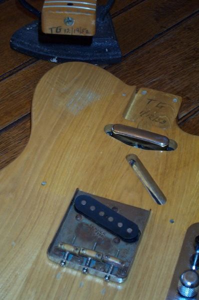 WOW! Where do I start? OK, here we go..... I'll start with the neck which is marked "T G 12/19/52" it's been oversprayed or possibly refinished. The decal and headstock has been oversprayed and it's difficult for me to tell if the logo is original or not. It looks to me as if it's been replaced at some point. The tuners are reissue no line Klusons. The body has also been refinished to natural(Hippie Wood). All of the correct dowells and pin router markings are all in the right places as well as the "router hump' near the neck pocket. The neck pocket is marked "T G 1/12/53". I think that the pencil markings on the end of the neck and the neck pocket were touched up when the refin occured. The pots have been replaced and they are marked "1376417" which translates to the 17th week of 1964. The bridge plate is original with serial number 3889 stamped on it and the saddles are also correct. The control cavity still has the piece of masking tape with "Gloria 1/22/53" on it. It was NOT touched up. Whoever did the refin proably carefully removed the taped before the refin and then placed it back afterwards. The bridge pickup looks original to me but the neck pickup I'm not sure of. The pickguard is not original. It comes with a generic black tolex hard shell case. This is just a super cool player 1952/53 Fender Telecaster that will not break the bank. Original examples are really bringing BIG $$$$$$. Own this one for a fraction of that! Buyer pays shipping and insurance. Payment is to be recived within 5 days of the auction close. Please be sure to emai with any questions. All auction sales are final.